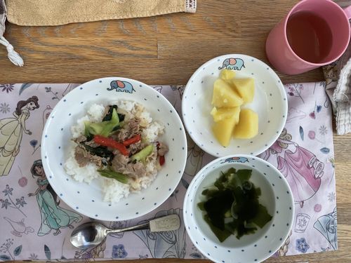 | ・野菜せんべい ・麦茶 | ・焼肉丼 ・さつま芋のレモン煮 ・わかめスープ ・麦茶 ・ | ・いちごジャムヨーグルト ・麦茶 |