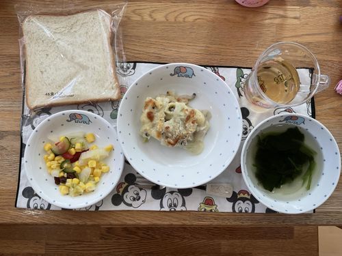 | ・蒸し南瓜 ・麦茶 | ・マカロニグラタン ・コーンサラダ ・コンソメスープ ・食パン ・麦茶 ・ | ・おかか胡麻おにぎり ・麦茶 |