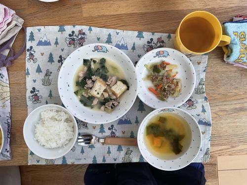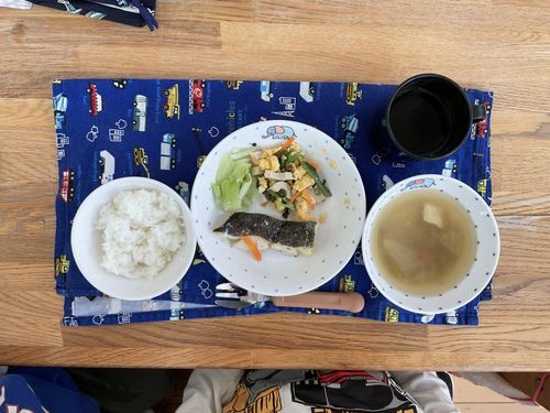 ・にんじん煮 ・麦茶 | ・白身魚の香味焼き ・茹できゃべつ ・青菜と玉子の和え物 ・味噌けんちん汁 ・ご飯 ・麦茶 | ・中華蒸しパン ・麦茶 ・ |