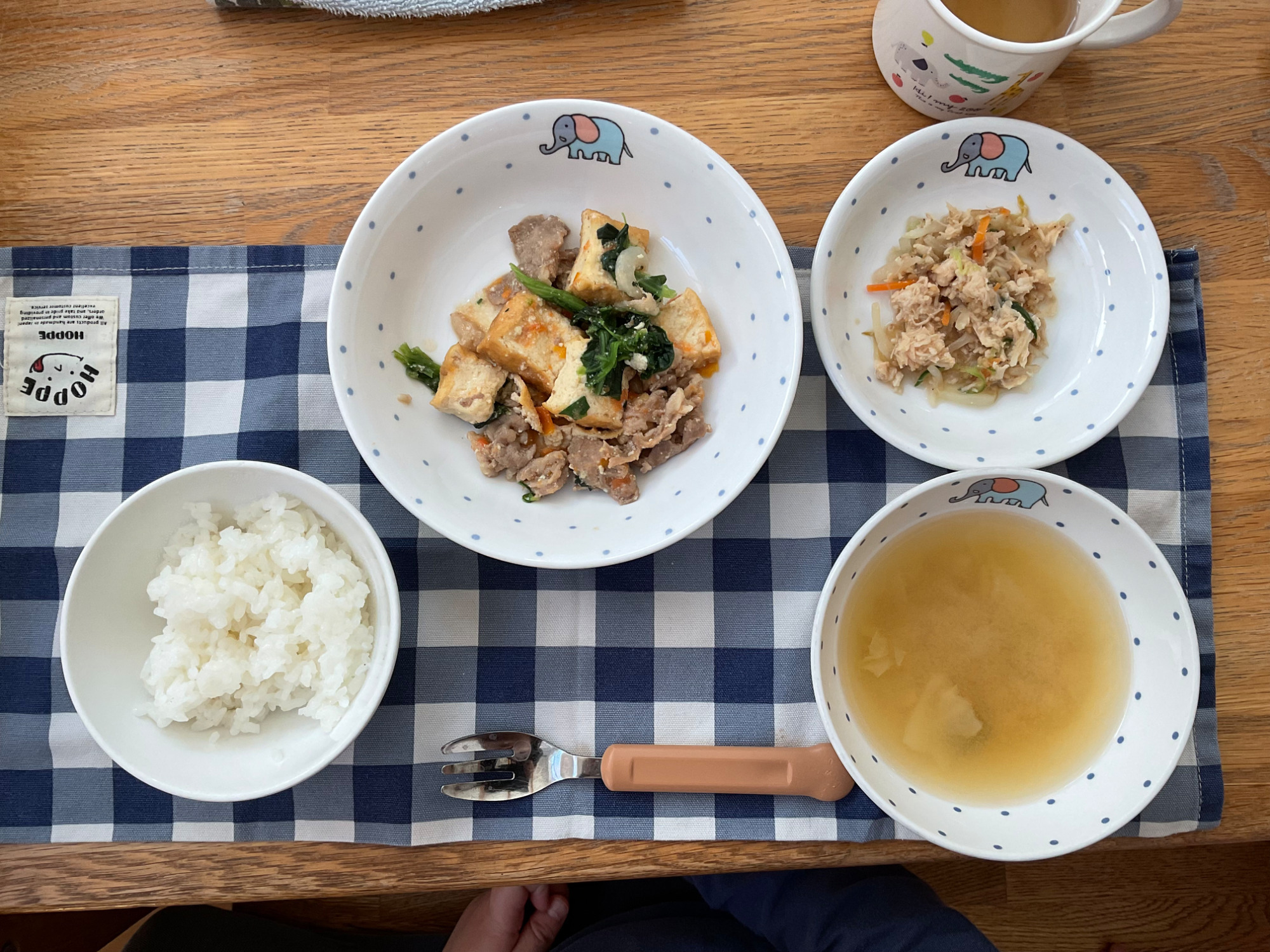 ・蒸しじゃが芋 ・麦茶 | ・厚揚げと豚の和風炒め ・棒々鶏サラダ ・味噌汁 ・ご飯 ・麦茶 ・ | ・味噌ポテト ・牛乳 |